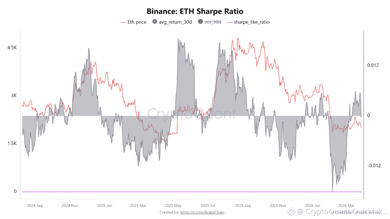 Ethereum data from Binance currently reflects a noticeable softening in risk-adjusted performance, signaling that recent market behavior has been relatively cautious. Over the past 30 days, the average return has hovered around -0.00039, while a Sharpe-like ratio near -0.0012 highlights that returns have not been keeping pace with the level of risk traders are exposed to.