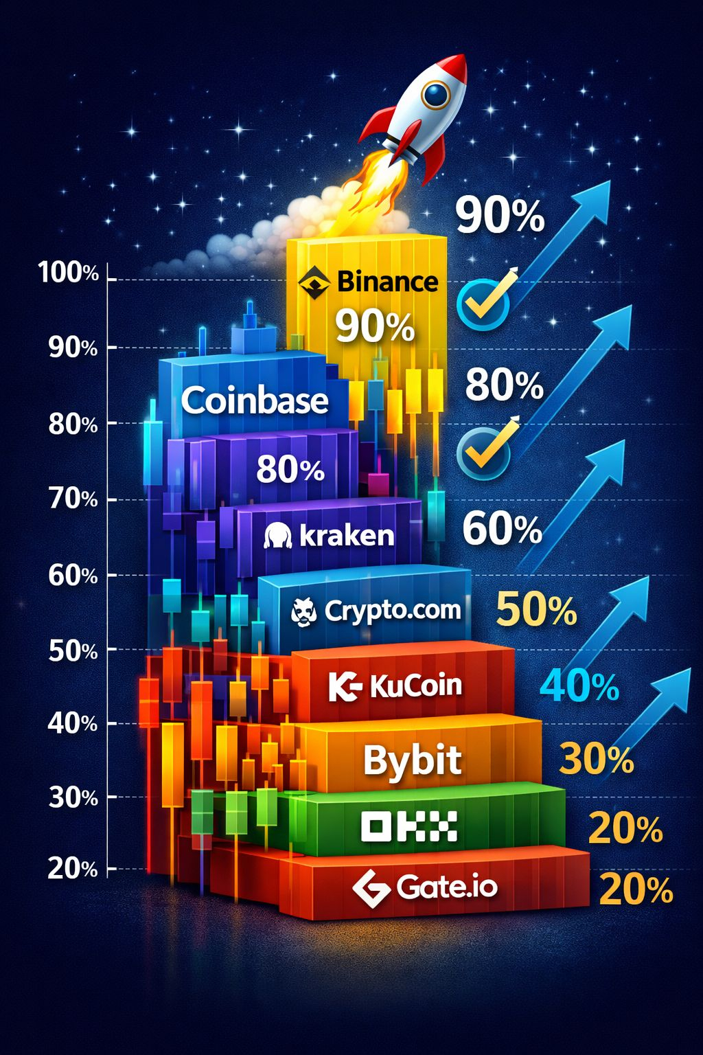 is the world’s number one crypto exchange, ranked at 90%, offering the highest trading volume, deep liquidity, and advanced features with rapid growth 🚀; followed by at 80%, a trusted and beginner-friendly platform; then at 70%, well known for its strong security and professional trading tools; stands at 60%, recognized for its crypto cards, rewards, and global usage; is at 50%, popular for altcoins and trading bots; at 40%, widely used for futures trading and high leverage; at 30%, offering Web3 and DeFi features; while is at 20%, known for listing a wide variety of new and emerging coins.