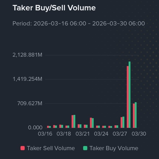 The taker buy/sell volume shows something interesting. Toward the end, both buy and sell volumes spike, but sell pressure is still very noticeable.