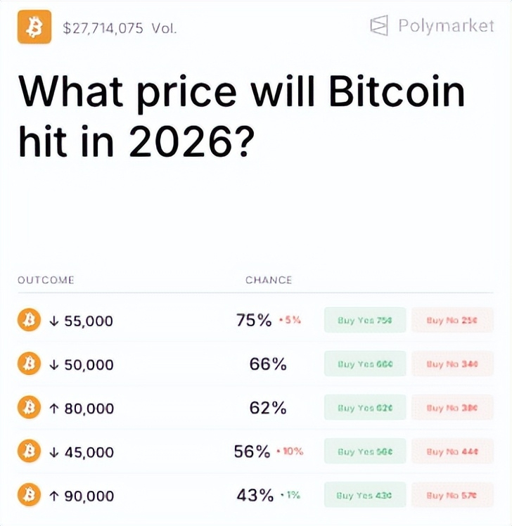 根据Kalshi的数据,今年比特币有30%的概率冲到10万美元,但Polymarket的预测则相对悲观,认为比特币跌破45,000美元的可能性达到52%。也就是说,市场对比特币未来走势仍然分歧严重。