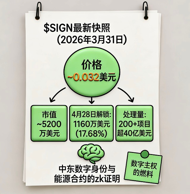 最新数据看得很清楚:$SIGN现在价格约0.032美元。市值约5200万美元。流通量16.4亿枚。4月28日有大解锁,约1160万美元,占流通17.68%。不过项目已经处理超过40亿美元的 attestations,服务200多个项目。