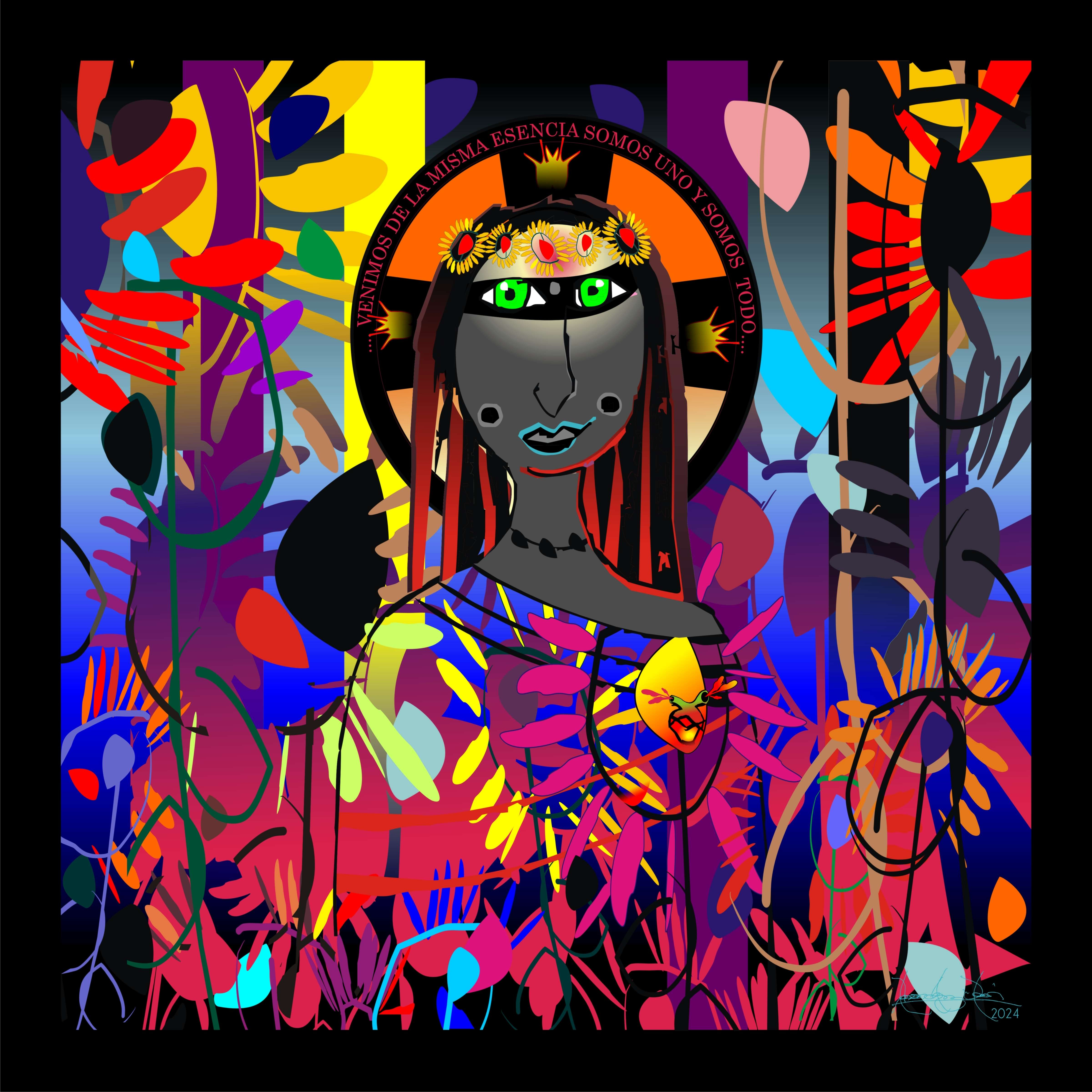 La obra que ilustra este artículo (creada originalmente en 2024) nos recibe con una frase poderosa: “Venimos de la misma esencia, somos uno y somos todo”.