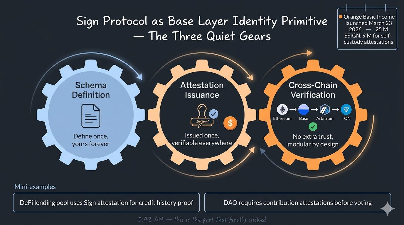 It hit me then: this wasn’t marketing. It was the first real test of whether Sign Protocol attestations could quietly become the base layer primitive for identity systems. Not the loud “decentralized ID” narrative everyone pushes. The actual mechanism — schemas you define once, attestations that travel across thirty-plus chains, verifiable without asking permission from any single bridge or oracle.