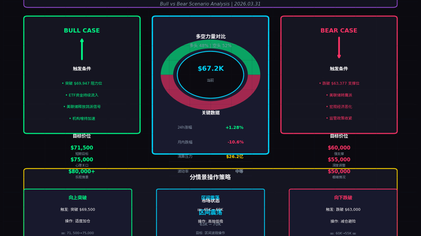 2026年3月31日,加密货币市场呈现温和反弹态势,比特币报约67,200美元,24小时涨幅约1.28%,以太坊报2,059美元,24小时涨幅2.63%。市场正处于关键的技术博弈阶段:上方69,947美元附近存在13.6亿美元空单清算压力,下方63,377美元则有12.6亿美元多单清算风险。从宏观层面看,美联储3月利率决议维持政策稳定,机构资金连续三周净流入比特币ETF达7.67亿美元,Strategy公司近期以70,194美元均价增持22,337枚比特币。然而,链上数据显示约38%的山寨币价格接近历史低点,市场流动性分化明显,比特币作为"流动性避风港"的地位进一步巩固。本报告将深入分析当前市场结构,并提出分层次的资产配置与操作策略。
