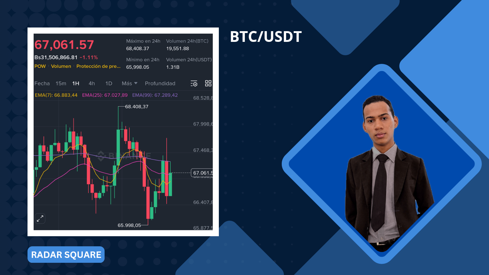En el gráfico de 1H, observamos una estructura bajista a corto plazo. El precio ha marcado máximos decrecientes y actualmente se sitúa por debajo de las EMAs clave (7, 25 y 99). La reciente vela verde intenta recuperar terreno tras tocar un mínimo de $65,998.05, pero la tendencia inmediata sigue bajo presión vendedora mientras no recupere los $67,300.