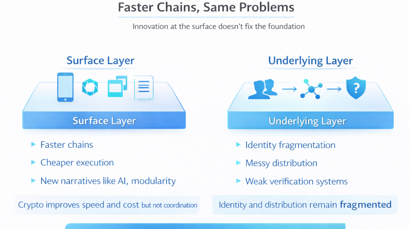 Perché se zoomo indietro, il modello è ovvio. Continuiamo a migliorare la superficie. Catene più veloci, esecuzione più economica, astrazioni più pulite. Ma l'esperienza reale sembra ancora assemblata alla bene e meglio. L'identità è frammentata. La distribuzione è confusa. La verifica è ancora screenshot e assunzioni più spesso di quanto le persone ammettano.