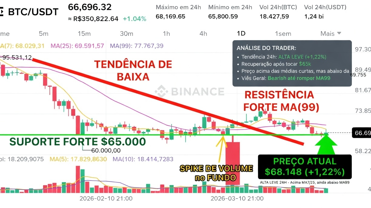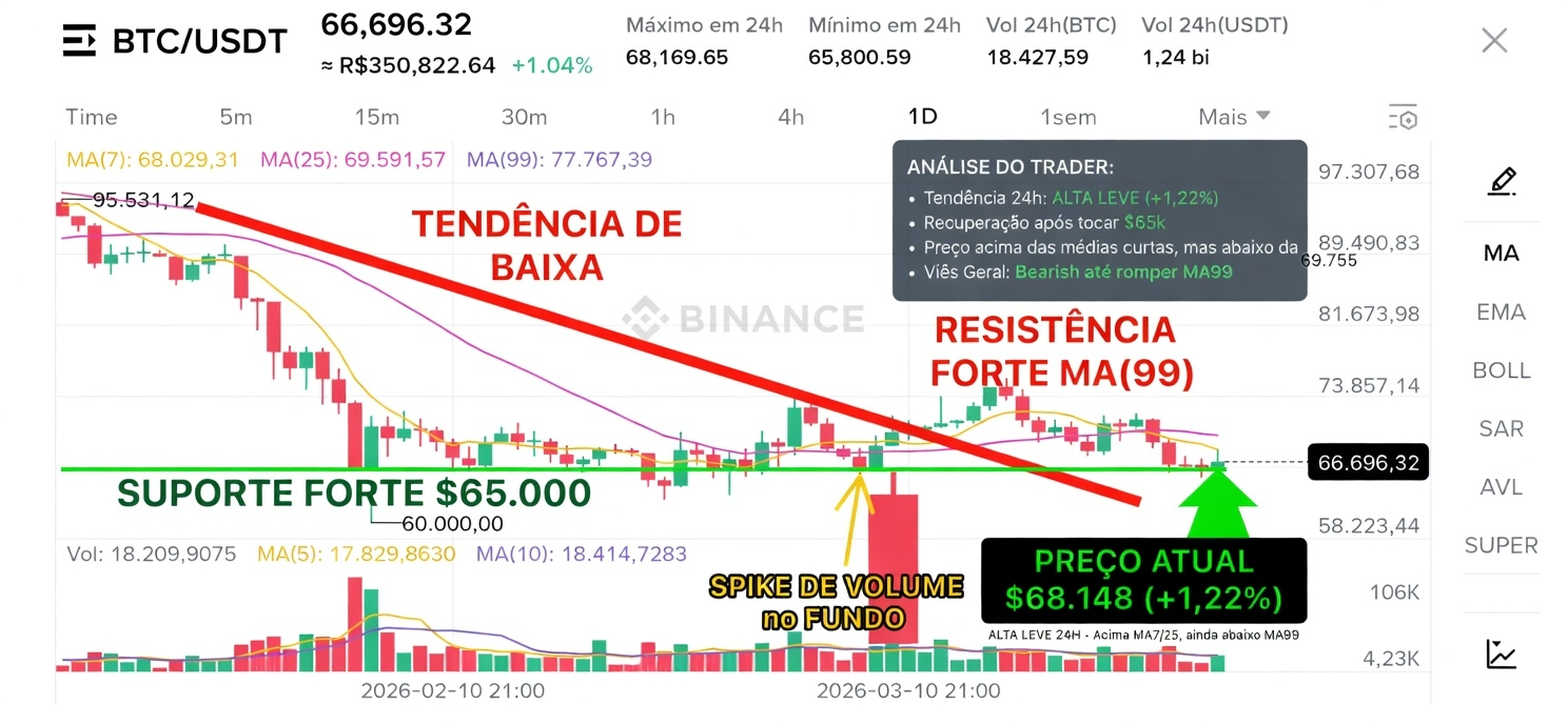 Depois de tocar a zona crítica de 65k, o preço subiu pra 68.148 (+1,22% nas últimas 24h) e já está acima das médias curtas (MA7 e MA25).