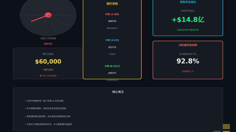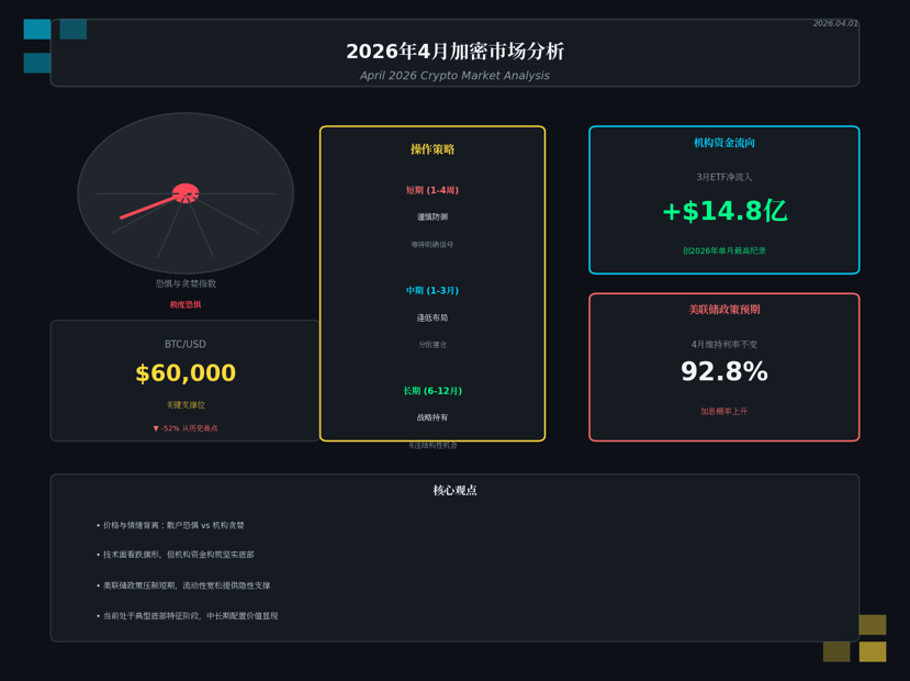 2026年4月1日,加密货币市场正处于关键的结构性转折点。比特币价格自2025年10月触及125,900美元历史高点后,已累计回调超过52%,当前徘徊在60,000美元关键支撑位附近。然而,与价格走势形成鲜明对比的是,机构资金正以前所未有的速度涌入比特币现货ETF——3月份单月净流入达14.8亿美元,创2026年以来最高纪录,其中3月9日至17日连续七天净流入14.7亿美元,显示"聪明钱"正在恐慌情绪中悄然布局。美联储4月维持利率不变的概率高达92.8%,但市场已开始定价6月加息预期,宏观流动性环境仍对风险资产构成压制。技术面呈现看跌旗形形态,但机构资金的持续流入或正在为下一轮上涨积蓄动能。本报告认为,当前市场处于"散户恐惧、机构贪婪"的典型底部特征阶段,短期或仍有下探风险,但中长期配置价值已逐步显现。