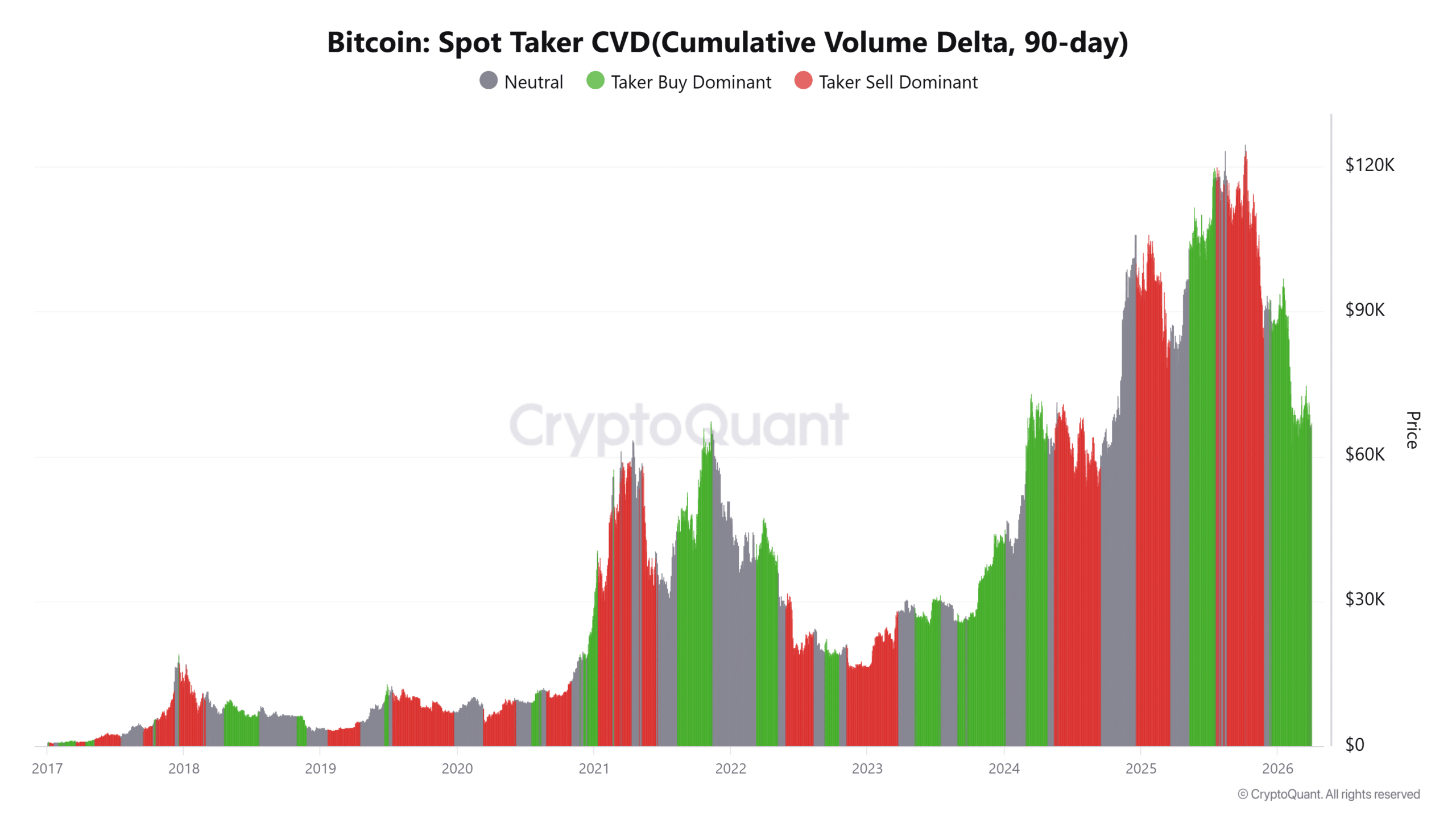 数据显示,当前市场是明显的“买方主导”——很多交易是通过主动买单完成的,说明有人在持续吃掉市场上的卖盘。但问题在于,这些买盘更多是在承接,而不是去主动拉高价格。