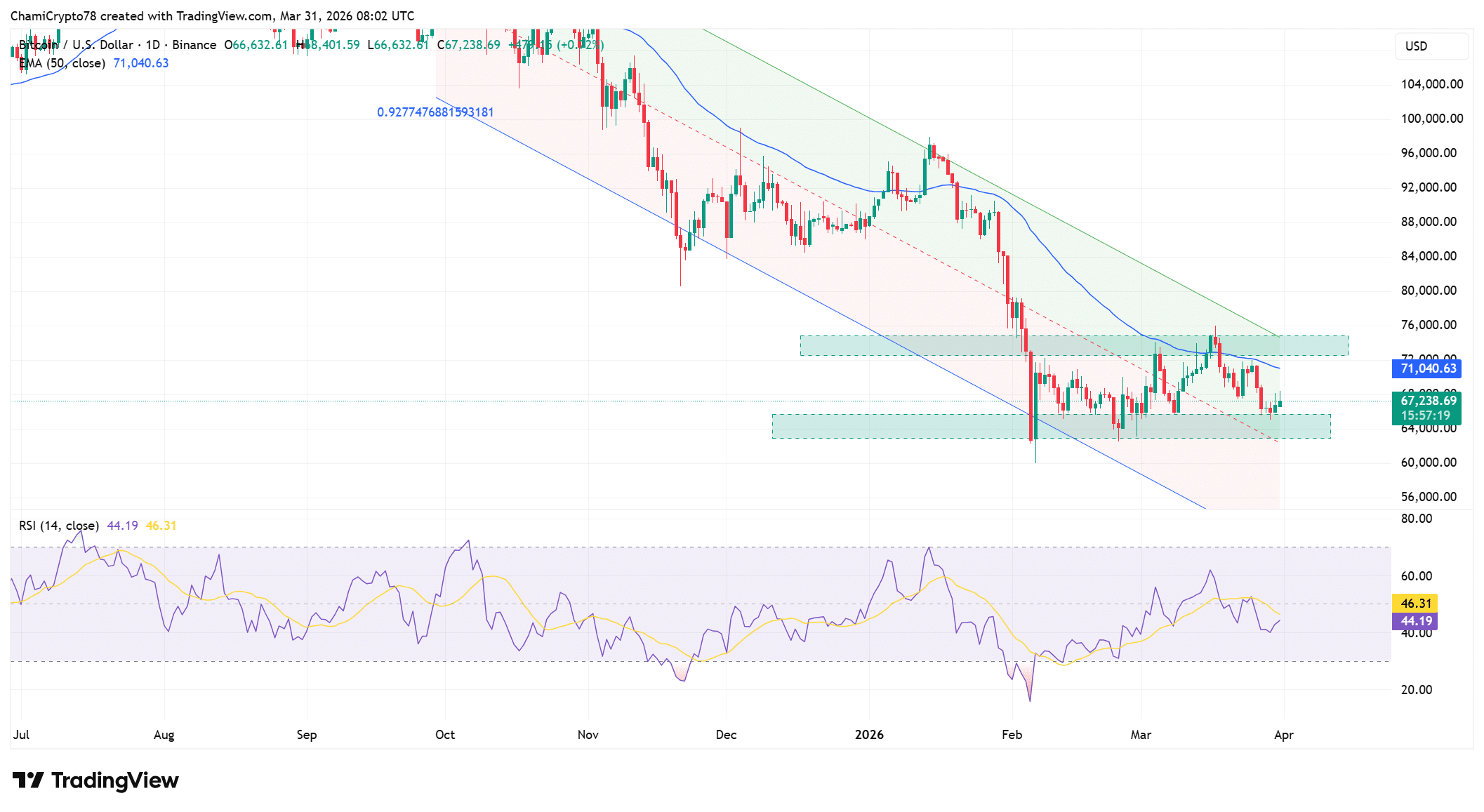 从技术面来看,比特币目前被卡在一个很明显的区间内:下方大约在64000美元到66000美元,上方则在71000美元附近。