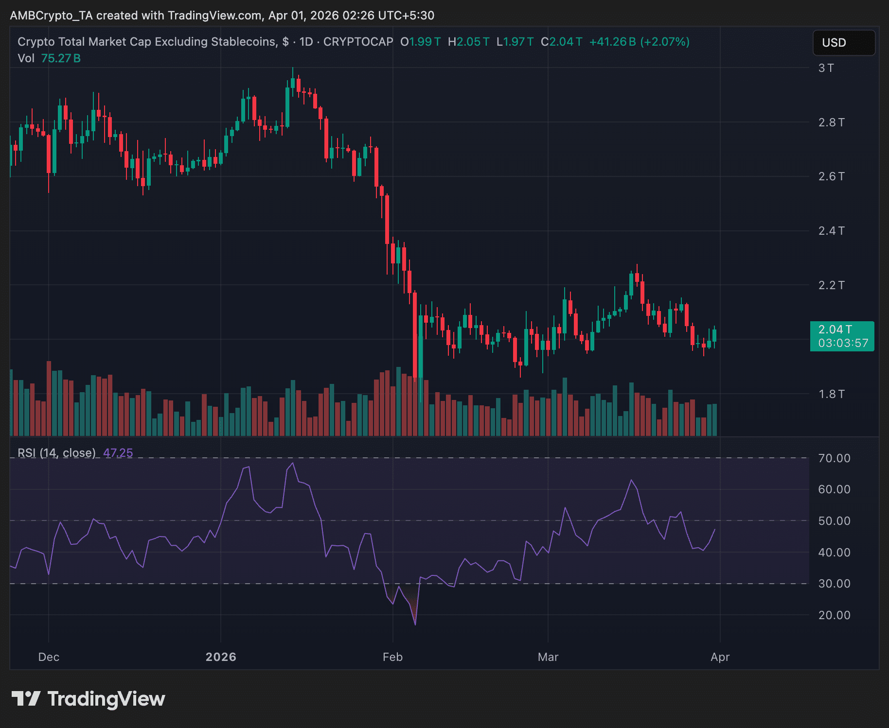 本季度初经历过大幅回调后,加密货币总市值基本稳定在既定区间内,价格主要在关键支撑和阻力之间波动,RSI指标也徘徊在中性区域。这说明下跌动能减弱,市场既没有出现大幅复苏,也未继续走低,呈现出“吸收风险、静待方向”的状态。