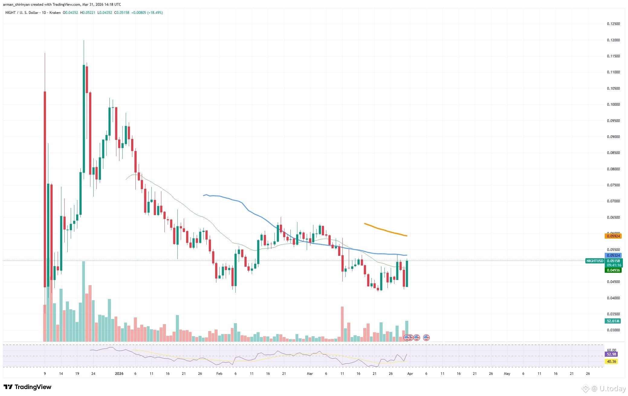 NIGHT sta attualmente spingendo nel suo primo cluster di resistenza significativo, che si trova tra $0.053 e $0.055. Questa zona è una barriera tecnicamente significativa poiché coincide con i livelli di rifiuto precedenti e le medie mobili a breve termine.