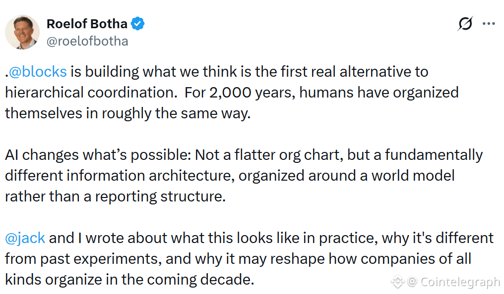 “We believe the pattern behind this, a company organized as an intelligence rather than a hierarchy, is significant enough that it will reshape how companies of all kinds operate over the coming years,” Dorsey and Botha said.