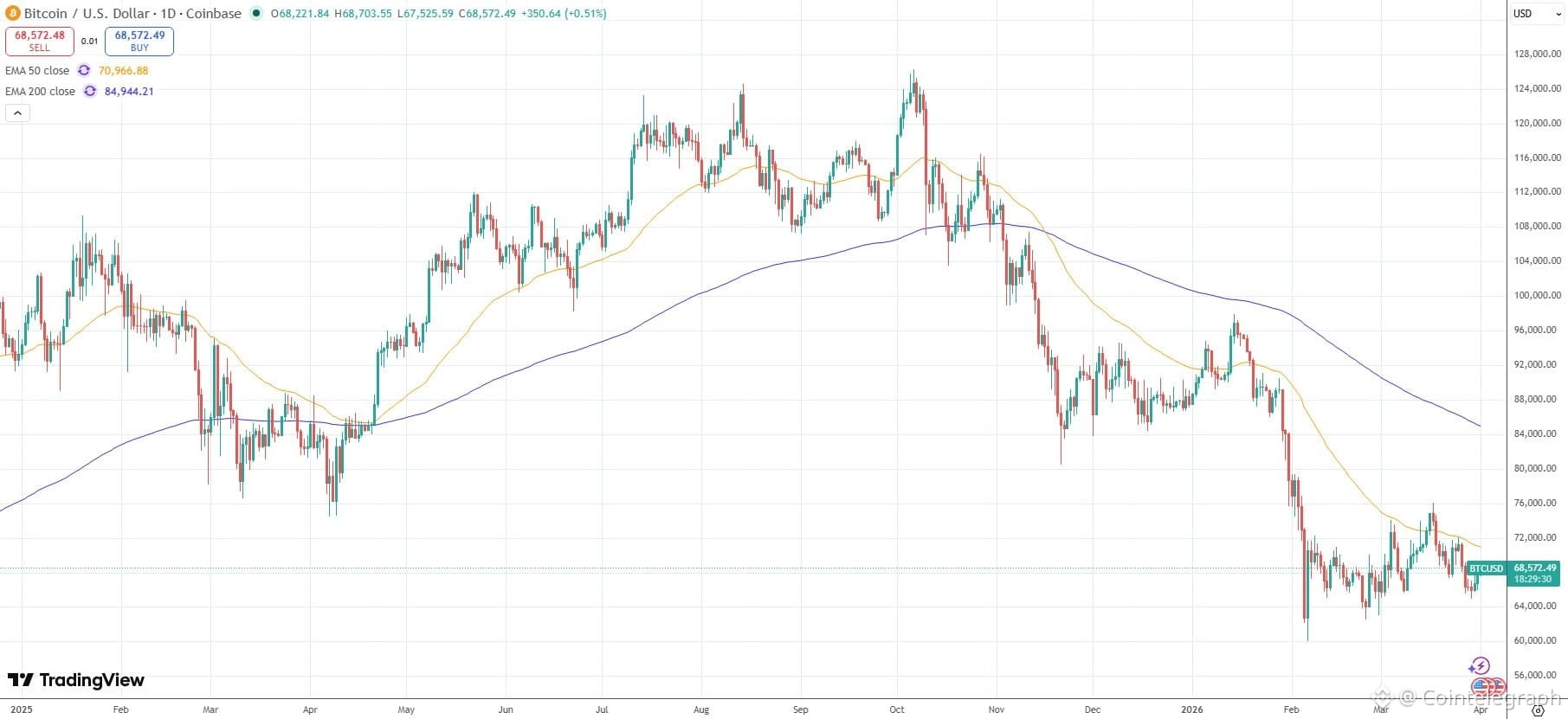 It is hovering at the 200-week EMA, around $68,000, which has served as a key level of support during previous market downturns.