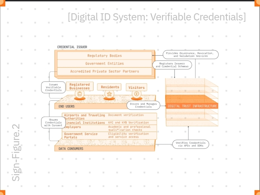 Sign’s digital ID system manages citizen identities, verifiable credentials, and data sharing with privacy and efficiency. Sensitive data remains off-chain; on-chain proofs ensure integrity and interoperability.