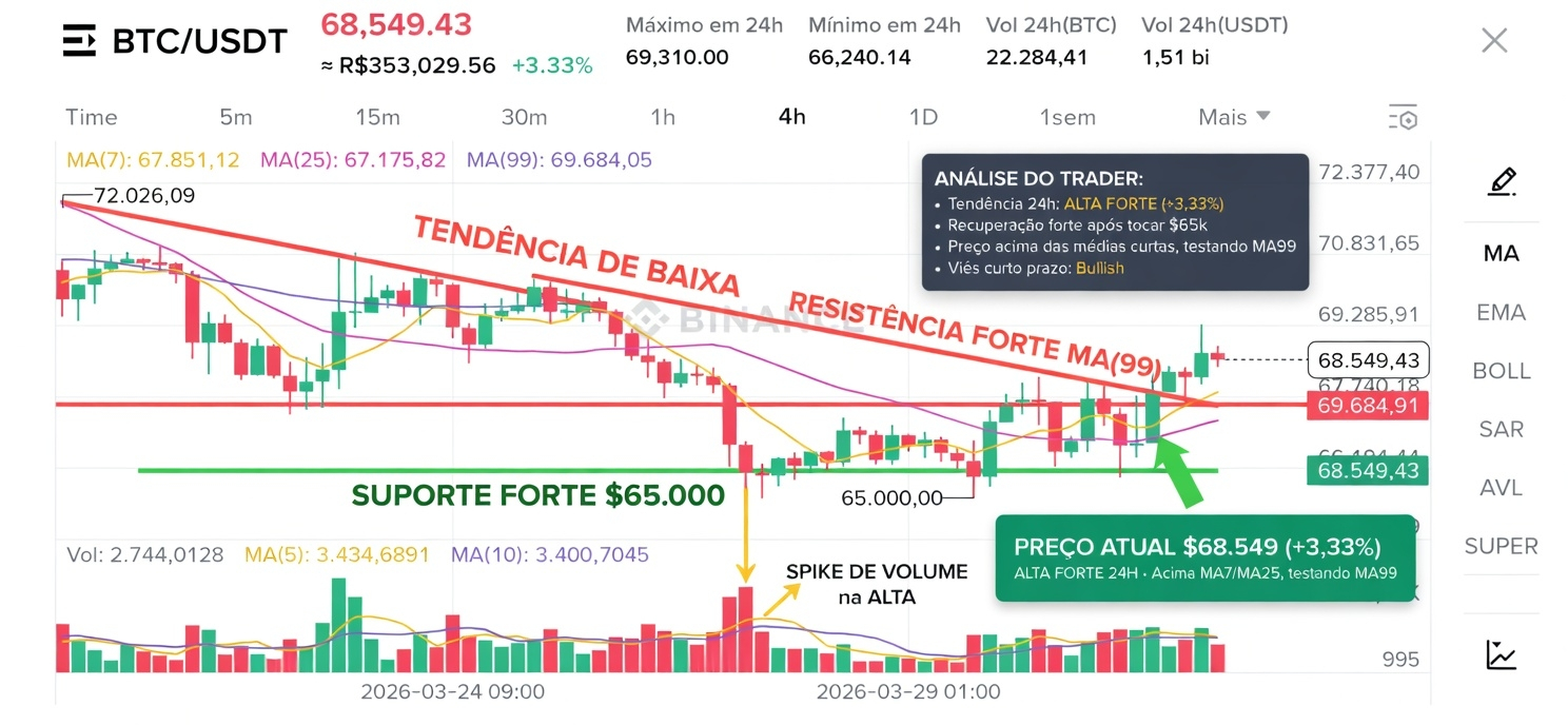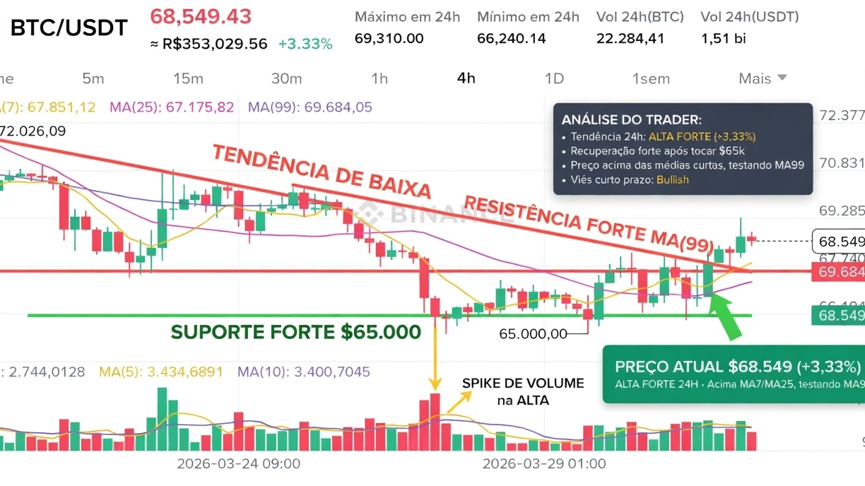 Preço subiu forte de 66.240 pra 68.549 (+3,33% nas últimas 24h), rompendo com força pra cima das médias curtas (MA7 e MA25) e já mirando a MA99.