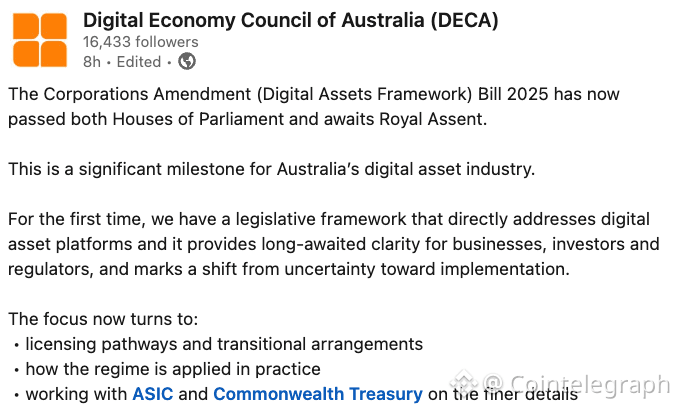 The Corporations Amendment (Digital Assets Framework) Bill 2025 has now cleared both houses of the Australian Parliament, according to parliamentary records, marking the biggest step yet in Canberra’s push to create a dedicated regulatory framework for digital assets.