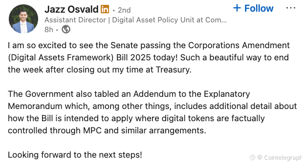 Jazz Ozvald, former assistant director of digital asset policy at the Commonwealth Treasury, took to LinkedIn to express delight at the milestone in passing the bill.