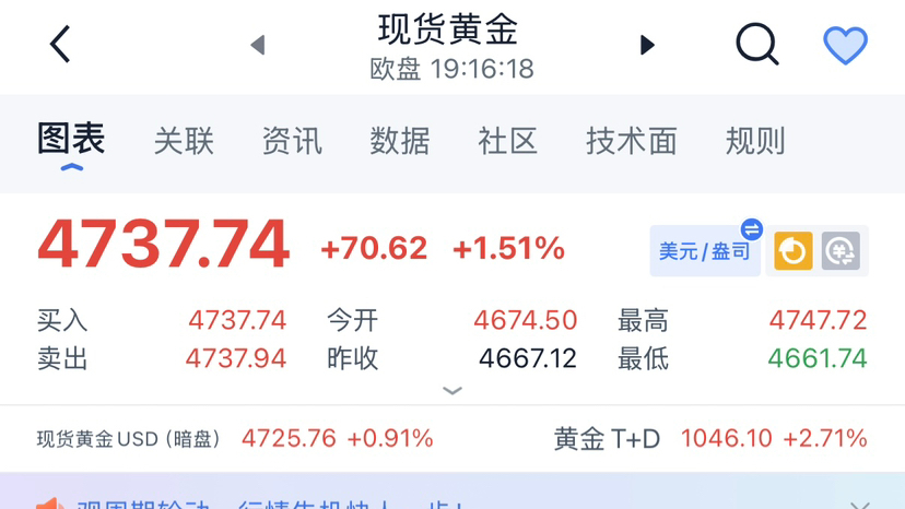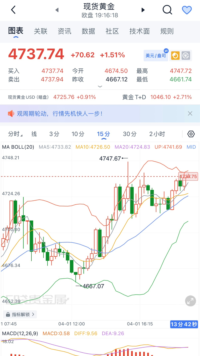 晚间黄金行情迎来关键抉择点,现价4737徘徊布林带中上轨,窄幅收敛蓄势待爆发,结合技术面与消息面双重信号,手把手教你布局,稳稳抓住这波红利!