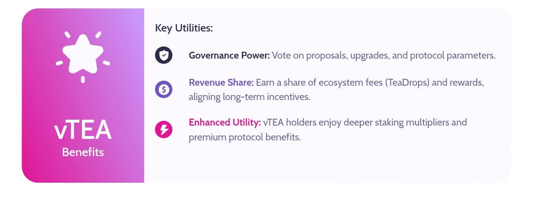 vTEA is the voice of the community, a benefit system built for builders, users, and long-term believers in TeaFi’s mission.