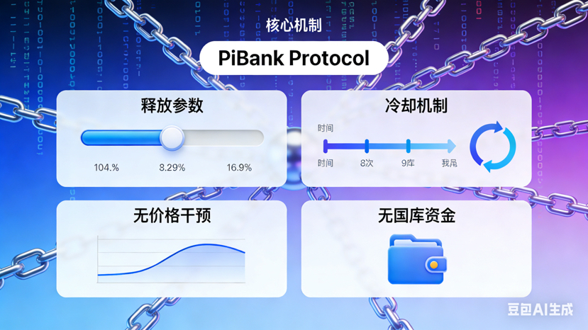 在 PiBank Protocol 的结构设计中,所有机制的出发点,从来不是短期价格表现,而是系统能否在长期中自洽运行。释放参数与冷却机制的设定,以及开发者社区不参与价格拉升、不设国库资金,均源于同一原则:让价格回归结构,让行为决定结果。