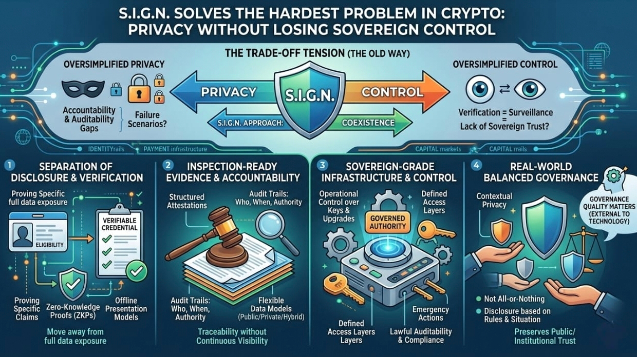 One thing I keep coming back to with SIGN is how calmly it approaches a problem that most systems either avoid or oversimplify: the relationship between privacy and sovereign control. In most architectures I’ve studied, this tension shows up early and gets resolved too quickly. The system picks a side. Either it leans so heavily into privacy that institutions start asking uncomfortable questions about accountability, auditability, and failure scenarios, or it leans so hard into control that “verification” quietly becomes another word for surveillance. And this tradeoff doesn’t stay theoretical for long. It becomes very real in identity systems, payment rails, and public benefits infrastructure, where sensitive data is not optional but foundational.