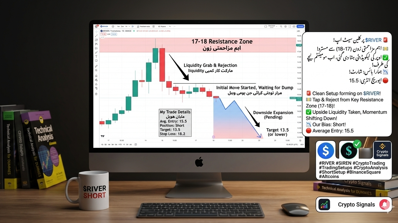$SRM The market is reacting exactly as we expected. Price just tapped into a key resistance zone (17–18 area) and showed a clear rejection. At the same time, upside liquidity has already been swept, and momentum is now starting to shift to the downside.$SRM