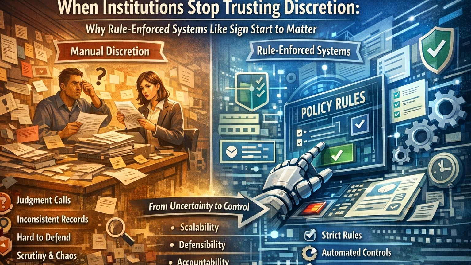 That is why I do not think the real question is whether manual decision-making was simply bad. The deeper issue is whether manual discretion became too expensive to explain. A person can make a fair decision and still leave behind a weak reason trail. A team can run a grant or benefits program honestly and still end up with duplicate payouts, uneven treatment, or records that do not survive later review very well. Once systems get bigger, the value of discretion starts running into the burden of justification. And that seems to be one of the tensions Sign is trying to answer. It is not only asking what should happen. It is asking how institutions will later prove that what happened followed the rules they said they were following.