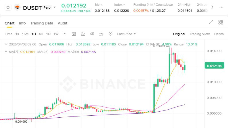 Текущая цена $D на Binance — 0.012192 USDT (+98% за 24 часа). RSI(24h) на уровне 76.1 сигнализирует о сильной перекупленности: импульс мощный, но растёт риск коррекции.