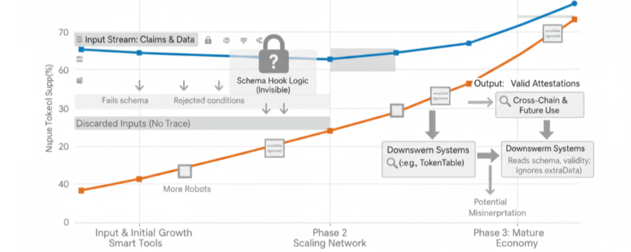 But most downstream systems, TokenTable, partner integrations, eligibility filters, they check schema match and attestation validity and then move. Nobody opens extraData. It's too much work for a binary yes-no gate.