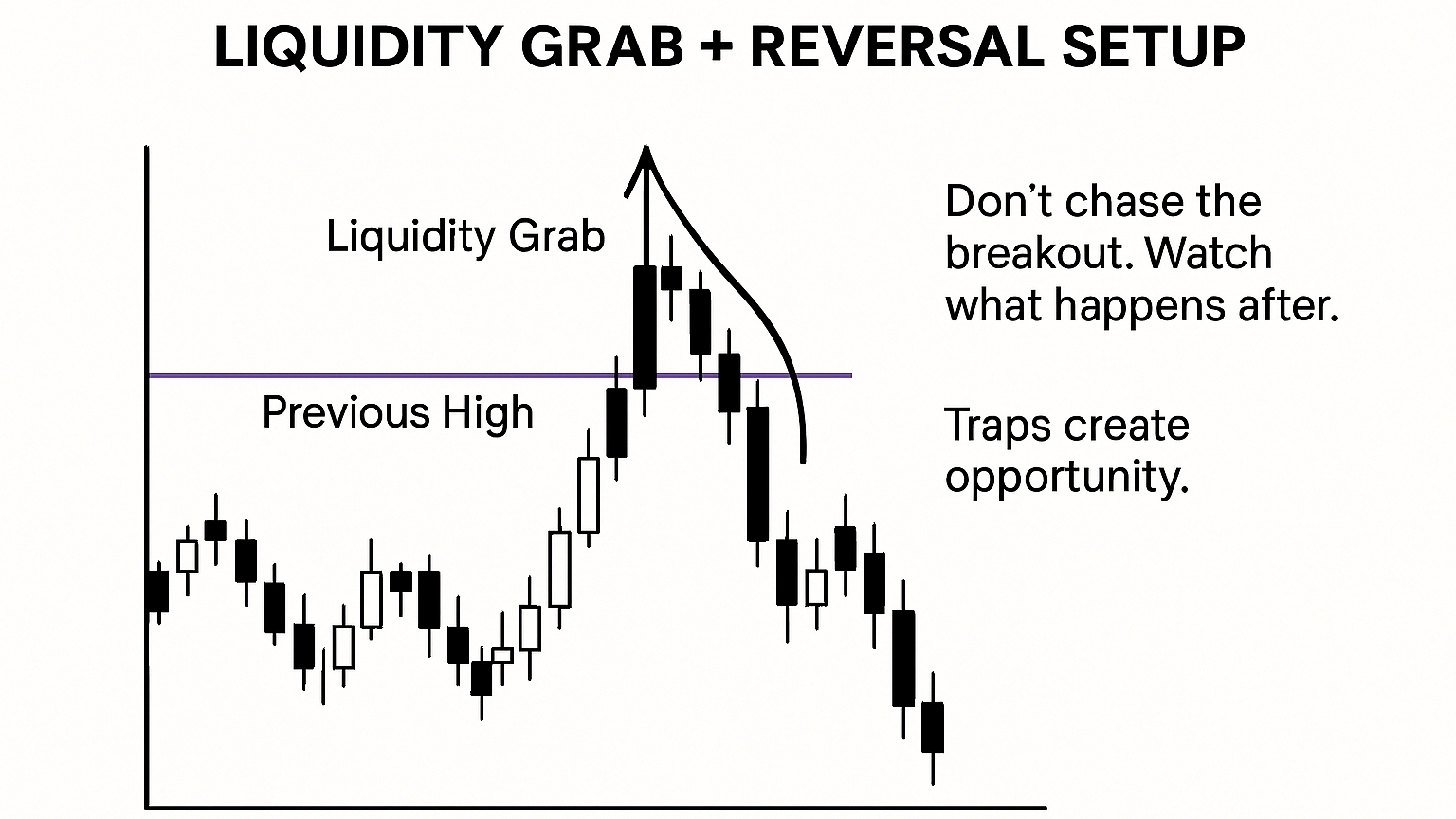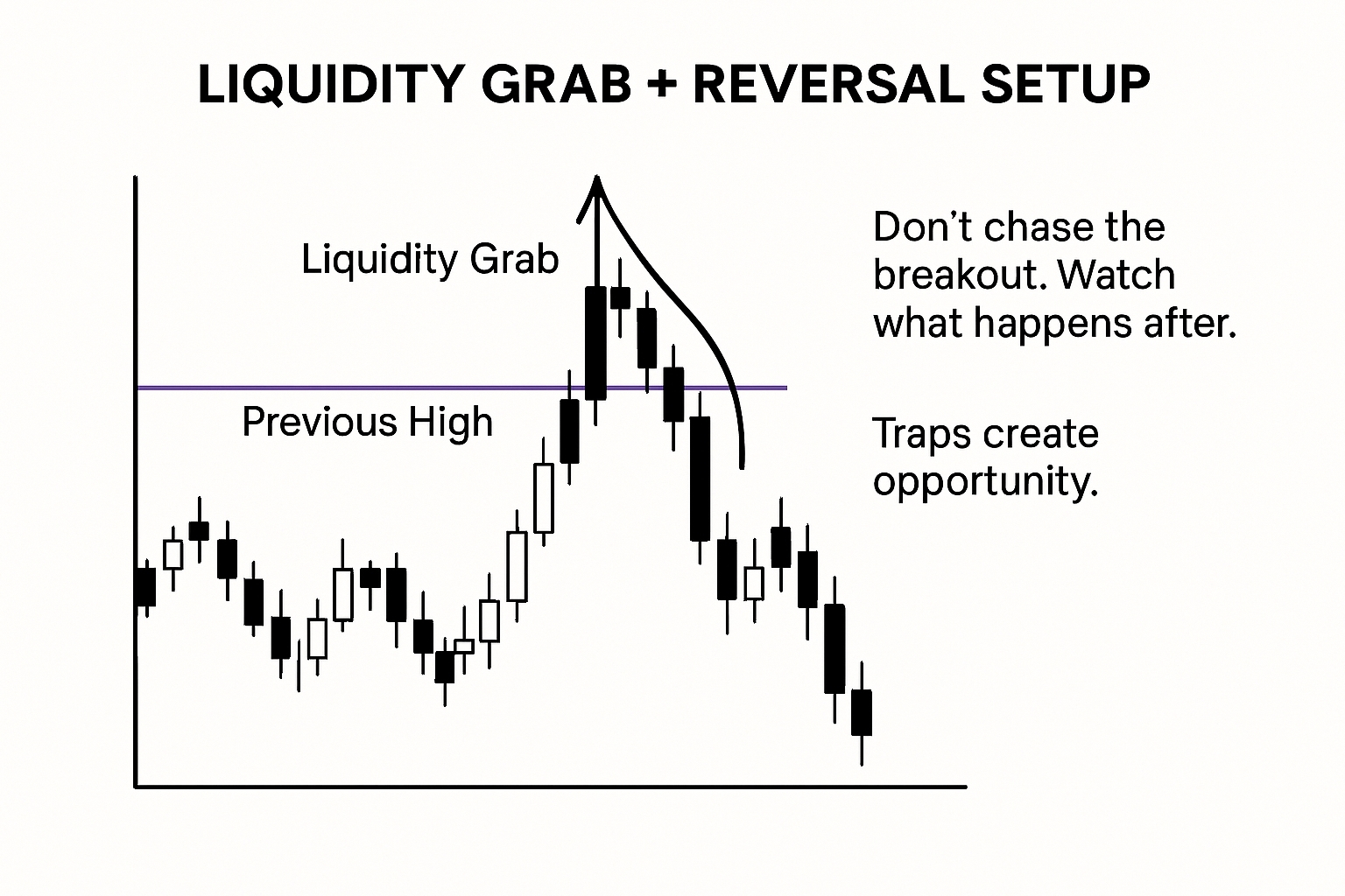 One of the most powerful setups is the liquidity grab followed by reversal. Price moves above a previous high (or below a low), triggering stop-losses, then quickly reverses direction.