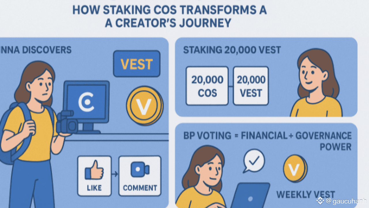 Quando Anna ha scoperto COS.TV, ha trovato non solo una piattaforma per condividere video, ma anche un ecosistema dove il coinvolgimento si traduceva direttamente in reddito. Il punto di svolta è arrivato quando ha deciso di mettere in stake il suo COS in VEST—una decisione che ha cambiato il suo ruolo da caricatore di contenuti a un reale stakeholder dell'ecosistema.