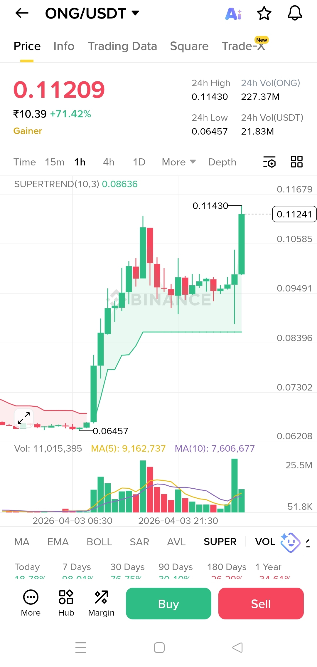 The chart shows a massive bullish momentum with ONG up over 71% in the last 24 hours. We are seeing a strong breakout above the previous consolidation zone, supported by high volume and a green SuperTrend signal.