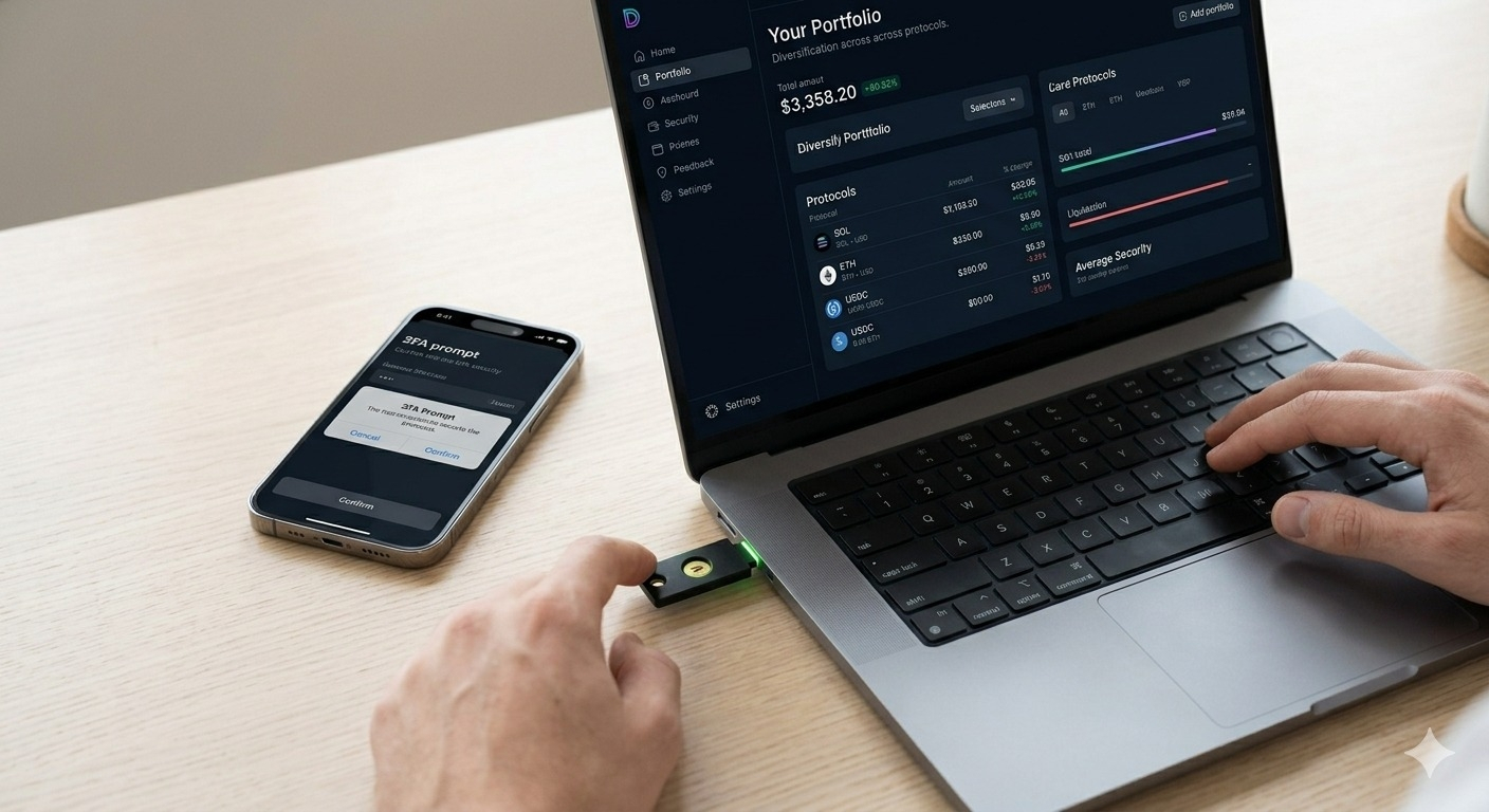 Our third and final image changes the situation from one (images 0 and 1) to a calm, controlled environment. In ambient daylight, a user is operating their silver laptop and smartphone on a clean desk. Both screens show a portfolio dashboard that emphasizes diversification (for example, SOL, ETH, and USDC in different protocols). A physical black hardware security key (like a YubiKey) is plugged into the laptop's USB-C port. Glowing with a green light. The user's finger is about to press this key. This step represents security and control, which is quite different from the panic in the previous images.