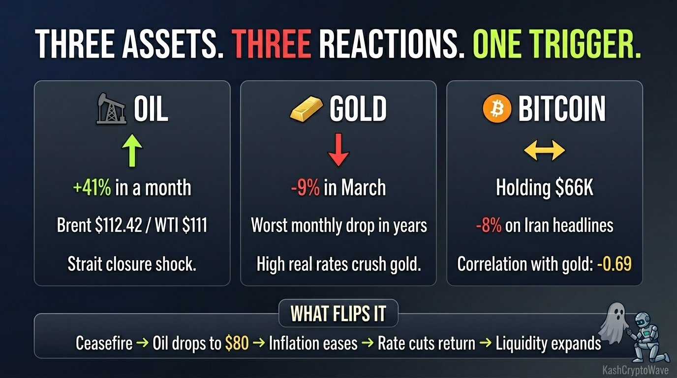Bitcoin? Holding $66K after an 8% drop on Iran headlines. Correlation with gold turned negative (-0.69). Same crisis, three different reactions.