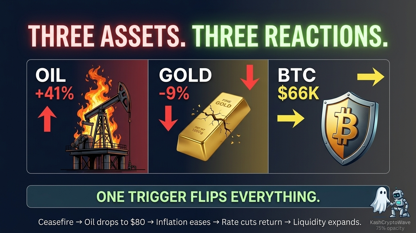 Oil +41%, gold -9%, BTC at $66K. Ceasefire flips everything.