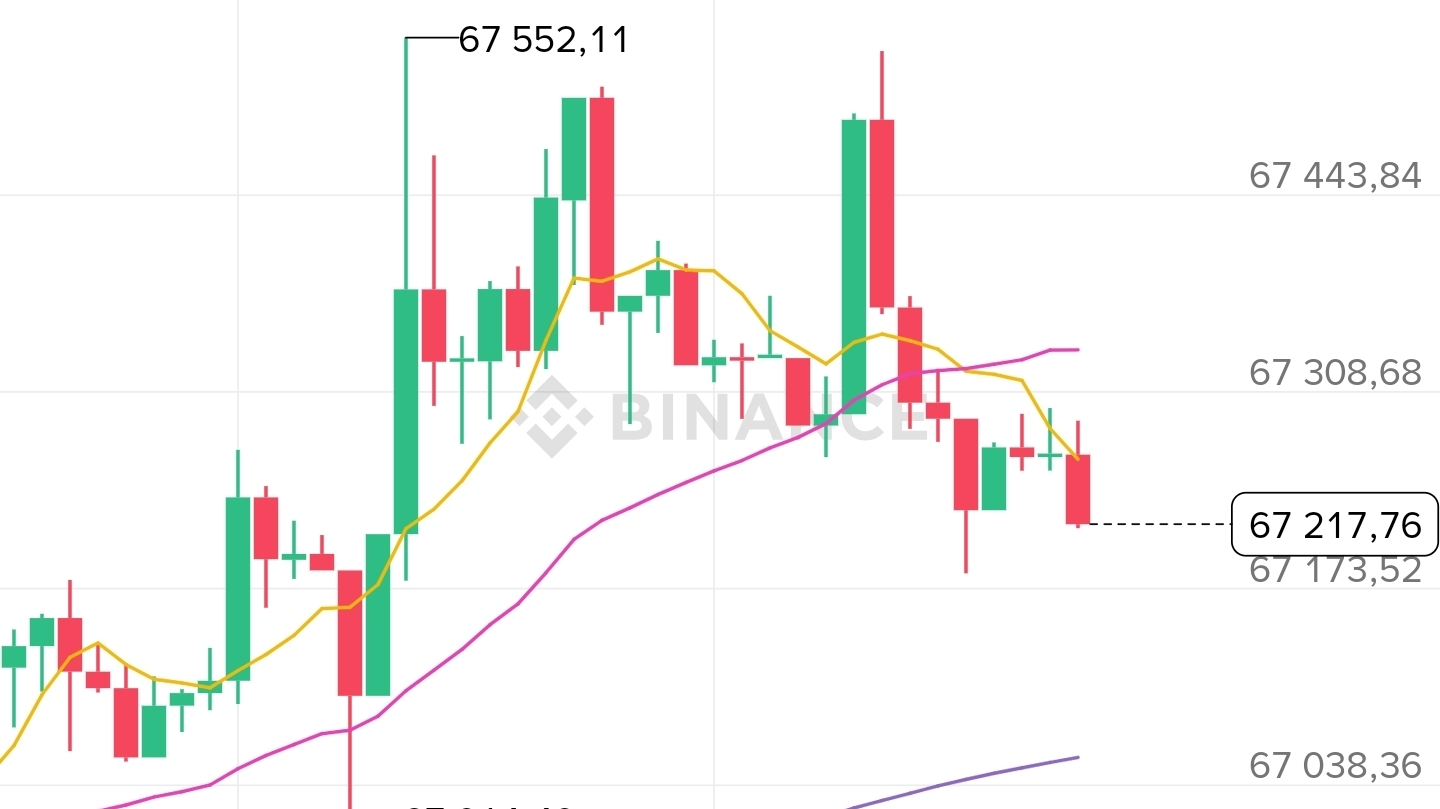Podívejte se na tu řadu červených svíček úplně vpravo. Bitcoin právě propadl pod fialovou čáru MA(25) na úrovni 67 337 USD.
