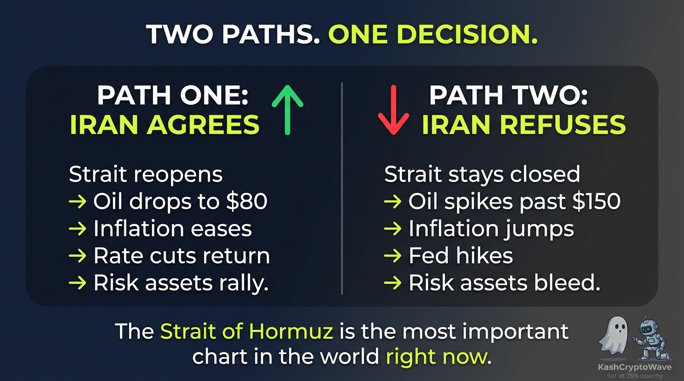 Path Two: Iran refuses. Oil spikes past $150. Inflation jumps. Fed hikes. Risk assets bleed.