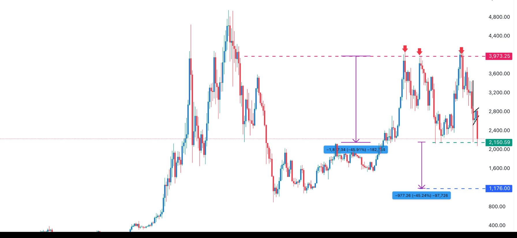 La regione di $3,200 ha precedentemente agito come supporto strutturale nei cicli precedenti, rendendola un obiettivo logico al ribasso in caso di un completo abbattimento.