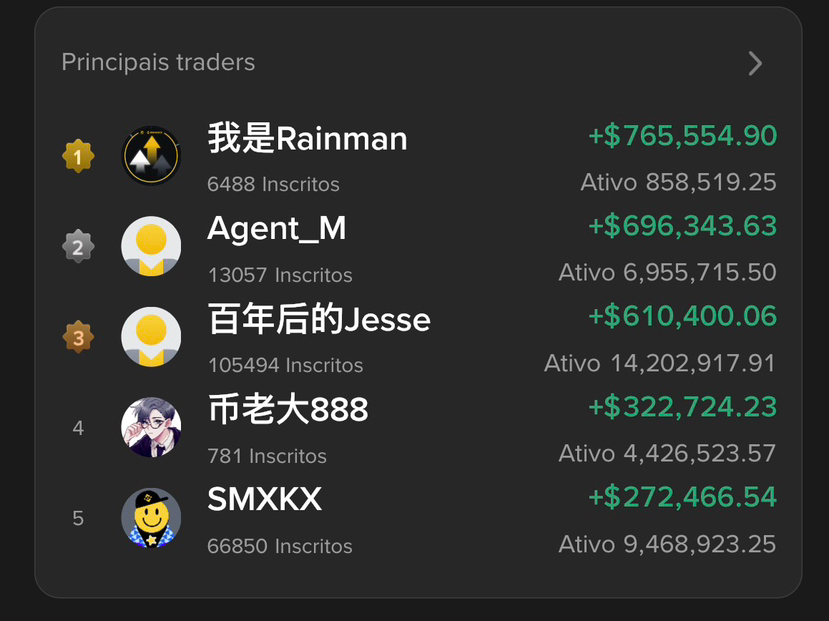 O ranking atual mostra traders com resultados fortes, alguns passando de US$ 700 mil de lucro e movimentando milhões em ativos.