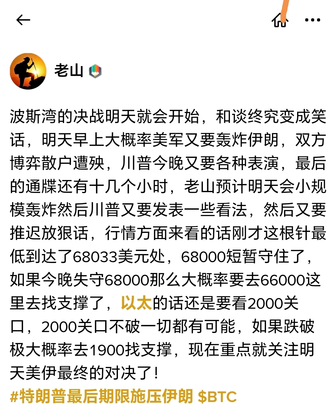 再来看看行情,大饼昨天最低跌倒67711美元处,以太最低跌倒2058美元处,昨天老山也说过66000这里如果支撑不住会带动以太跌破2000但好事多磨昨天在66000这个大支撑支撑住了以太也没完全带动下去,凌晨看川普没乱说话老山让粉丝跟着进了一单多今天也是吃了一波小肉,那么接下来的话进入了我们的区间了,站稳了7万和2200这个位置了,前文提过7万和2200这个位置很关键,现在看来到达这个区间之后,大饼压力依旧在75000关口以太在2400关口,如果这次想突破上方压力那么就要看后天完全谈判,短暂的利好不代表反转,但吃波段可以,散户要做的就是跟着局势走,而不是去迷茫,山寨的话目前思路不变不碰没前景后面山寨更没有会被美股代币而取代。