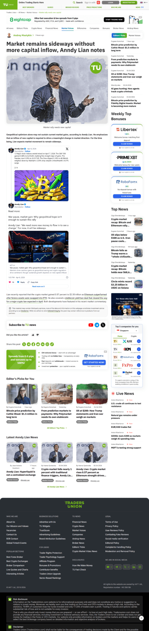 Il mercato rimane laterale senza un ulteriore afflusso di capitale, nota Anndy Lian