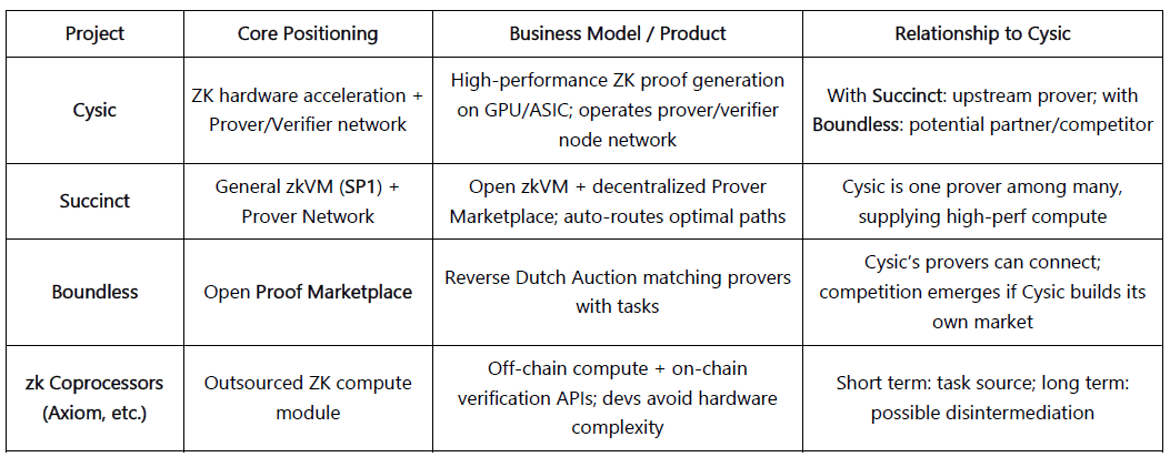 Dinamiche competitive: scontri a lungo termine a livello di accesso del cliente con Succinct/Boundless (mercati) o coprocessori zk maturi potrebbero spingere Cysic verso un ruolo di "produttore a contratto" upstream.