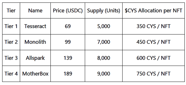 La fornitura totale di NFT è di 29.000 unità, con circa 16,45 milioni di CYS distribuiti (1,65% della fornitura totale, entro il limite di allocazione della comunità del 9%).