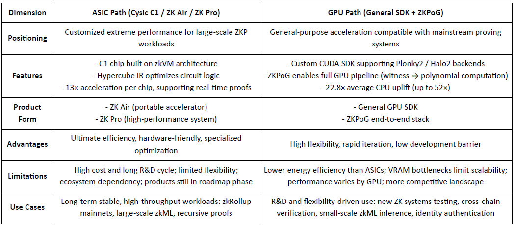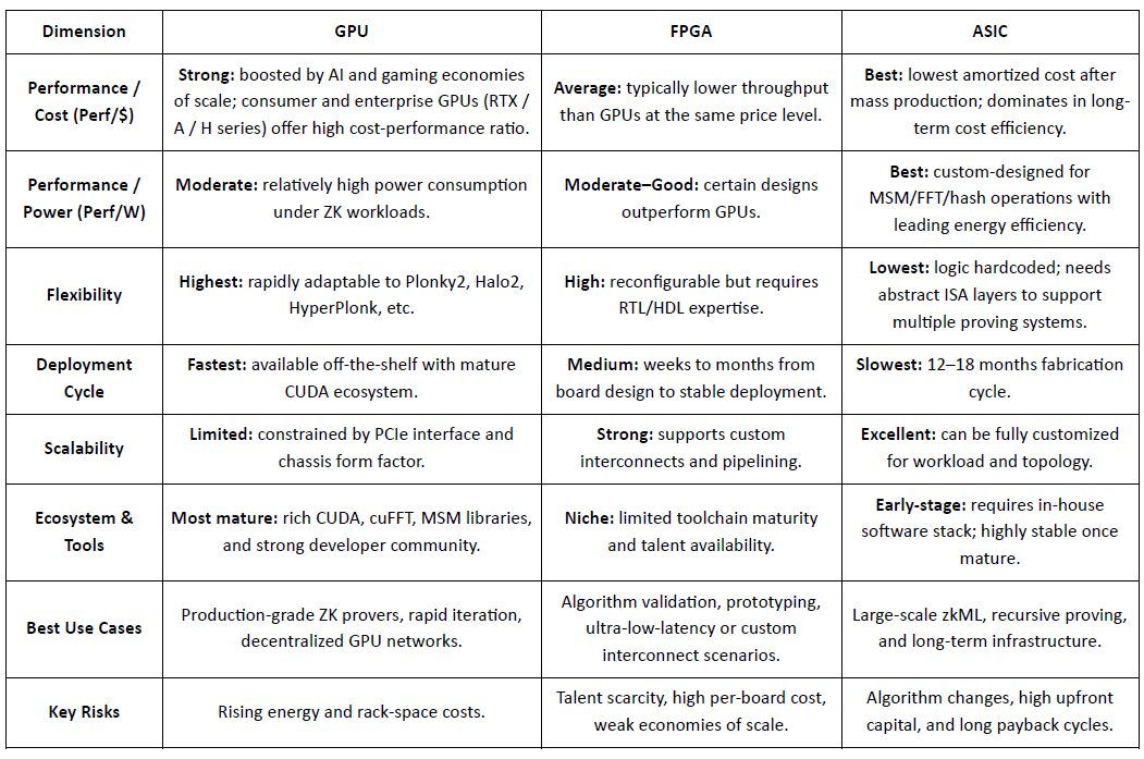 Nel documento rappresentativo "ZK Hardware Acceleration: The Past, the Present and the Future", il team sottolinea che le GPU offrono flessibilità ed efficienza dei costi, mentre gli ASIC sono più performanti in termini di efficienza energetica e prestazioni di picco, ma richiedono compromessi tra costi di sviluppo e programmabilità.