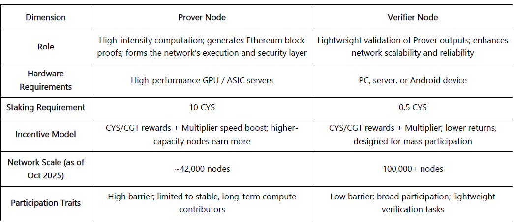 La testnet ha integrato Succinct, Aleo, Scroll e Boundless, attirando oltre 55.000 wallet, 8 milioni di transazioni e oltre 100.000 dispositivi GPU di fascia alta riservati. 1,36 milioni di utenti registrati, 13 milioni di transazioni, ~223 k Verificatori + 41,8 k Prover = oltre 260 k nodi totali. 1,46 milioni di token totali distribuiti (733 k $CYS + 733 k $CGT + 4,6 milioni FIRE) e oltre 48.000 utenti puntati, convalidando sia la sostenibilità degli incentivi che la scalabilità della rete.