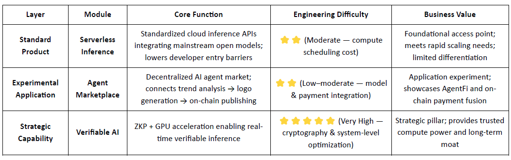 Il framework aziendale di Cysic AI segue una struttura a tre livelli: Prodotto, Applicazione e Strategia: alla base, Serverless Inference offre API standardizzate per ridurre la barriera per l'accesso al modello di intelligenza artificiale; al centro, Agent Marketplace esplora le applicazioni on-chain degli agenti di intelligenza artificiale e la collaborazione autonoma; al vertice, Verifiable AI integra l'accelerazione ZKP + GPU per consentire un'inferenza affidabile, rappresentando la visione a lungo termine di ComputeFi.