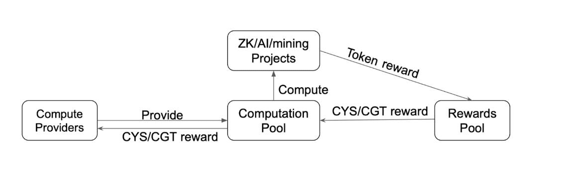 Gli utenti possono contribuire con le proprie risorse di calcolo o acquistare dispositivi Digital Harvester per eseguire attività di prova e guadagnare premi in $CYS / $CGT. Un fattore moltiplicatore aumenta la velocità di acquisizione delle attività. Ogni nodo deve puntare 10 CYS come garanzia, che può essere decurtata in caso di cattiva condotta.