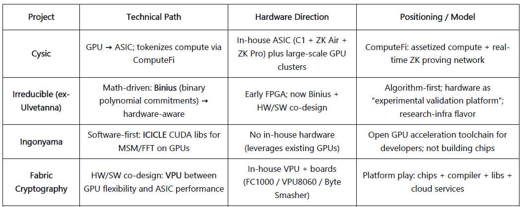 Nel settore dei dimostratori accelerati tramite hardware e ComputeFi, i principali colleghi di Cysic includono Ingonyama, Irreducible (in precedenza Ulvetanna), Fabric Cryptography e Supernational, tutti focalizzati su "hardware + reti che accelerano la dimostrazione ZK".