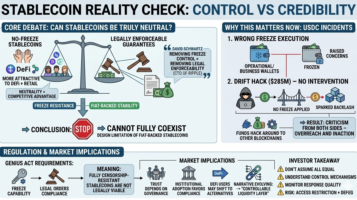 A major debate is unfolding after David Schwartz (CTO of Ripple) challenged the idea of “freeze-proof” stablecoins — right as Circle faces criticism from both sides of the spectrum.